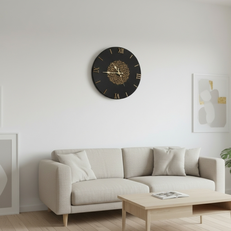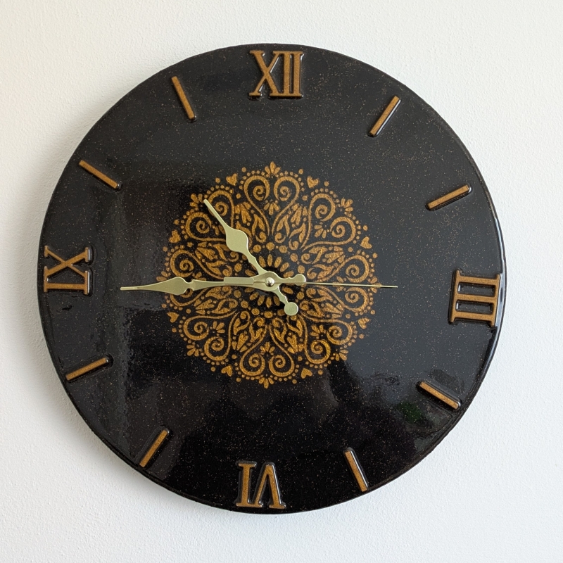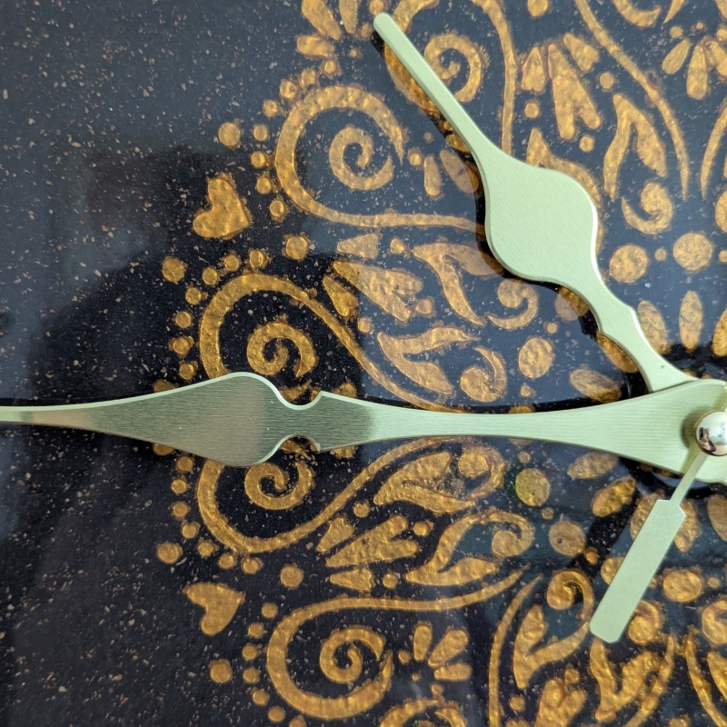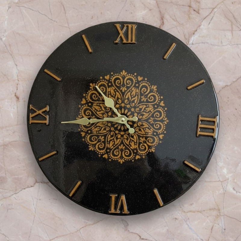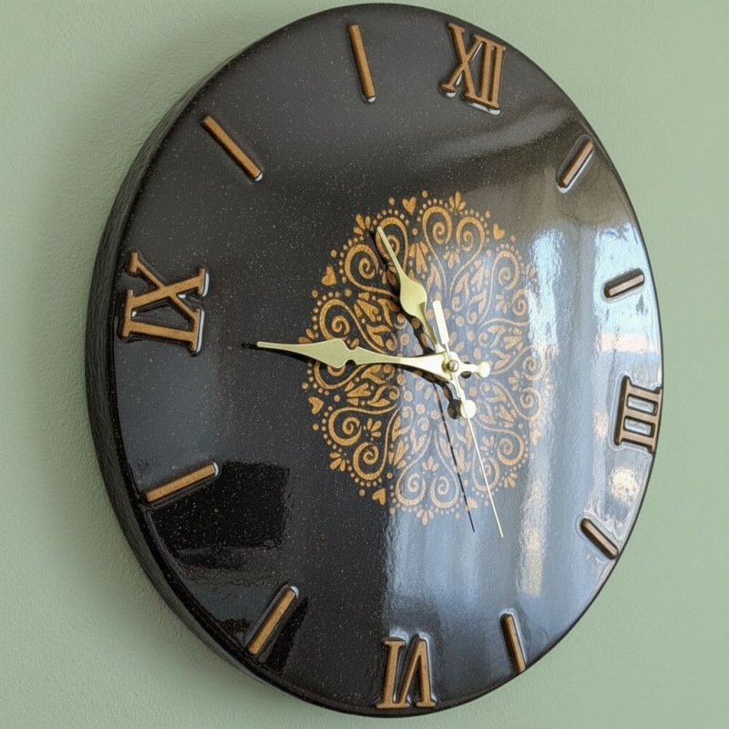 Elegante orologio artigianale in sughero vetrificato con decoro mandala oro, leggero e resistente. Il quadrante con numeri romani a rilievo in resina oro antico dona raffinatezza e si adatta a ogni stile di arredamento, dal classico al moderno. La superficie vetrificata a mano, rende ogni pezzo unico e irripetibile. Diametro 38 cm.