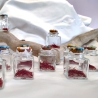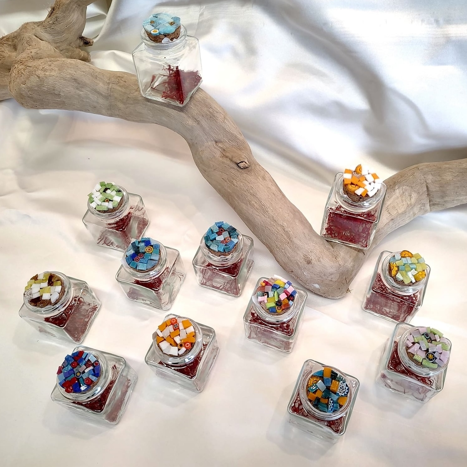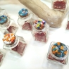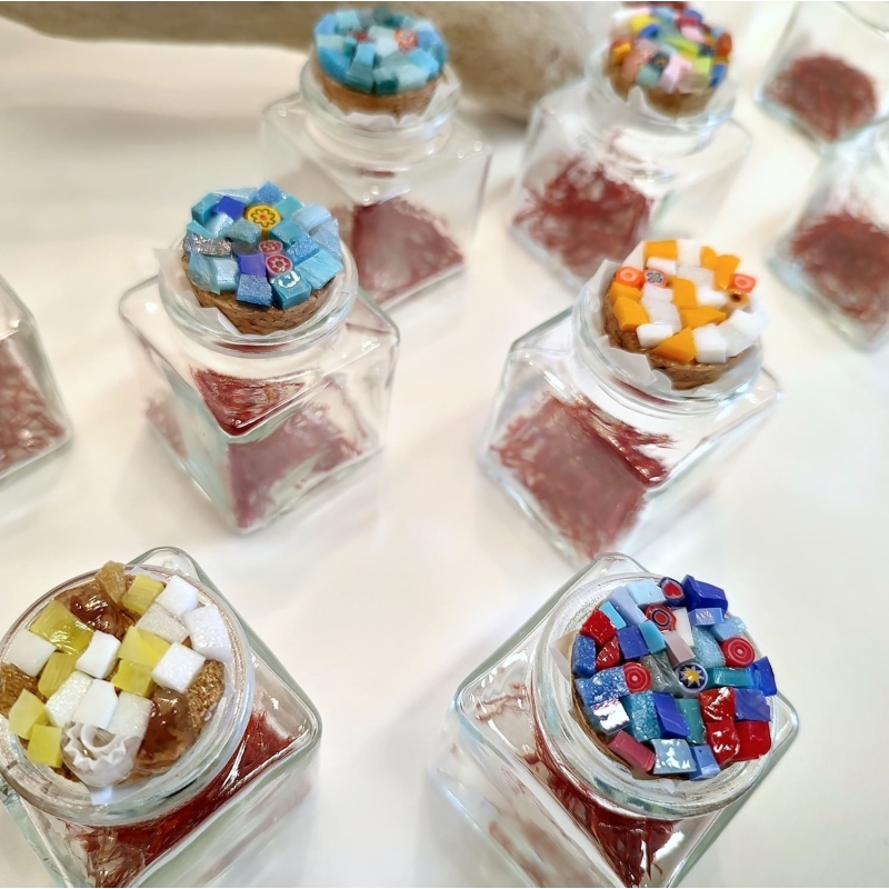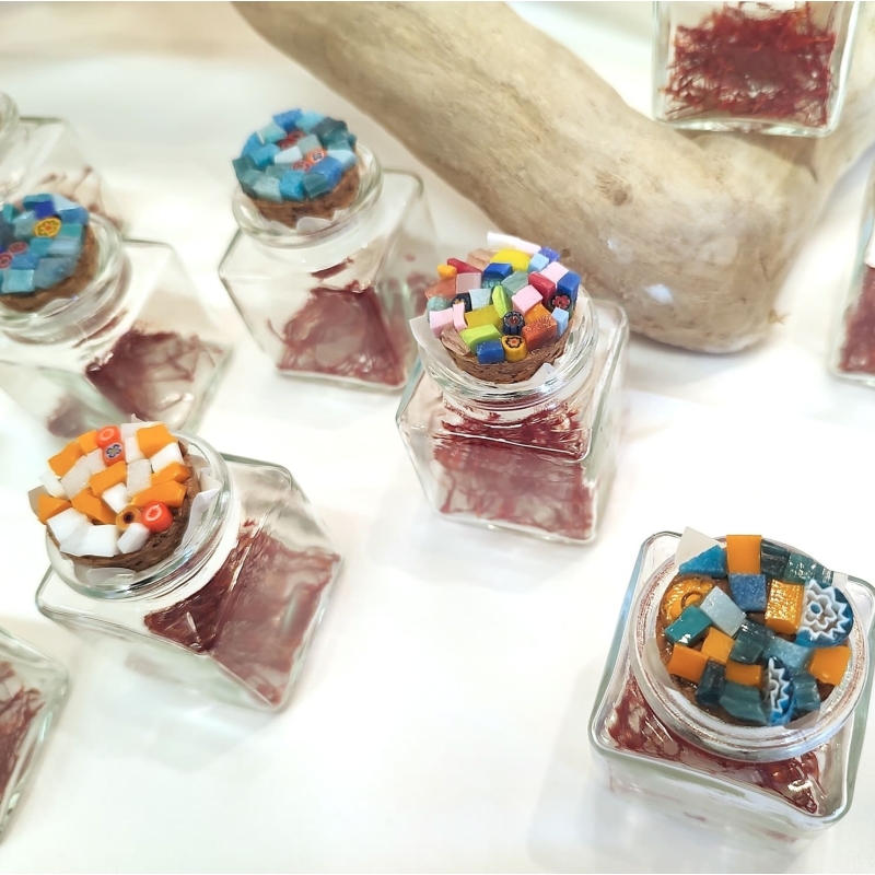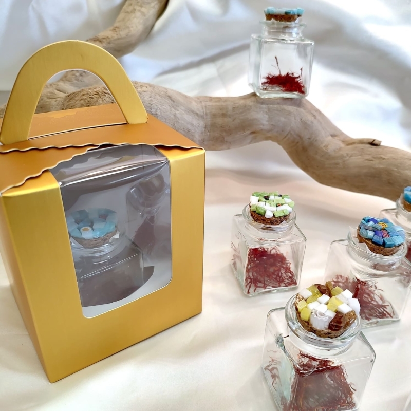 Un’elegante confezione in cartoncino dorato che contiene un'ampollina in vetro chiusa con tappo decorato in mosaico e che può essere personalizzata con i colori desiderati.