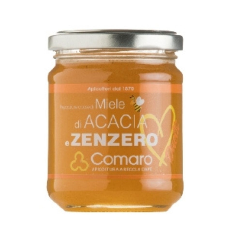 Preparazione alimentare a base di miele di acacia (99%) e zenzero in polvere (1%).