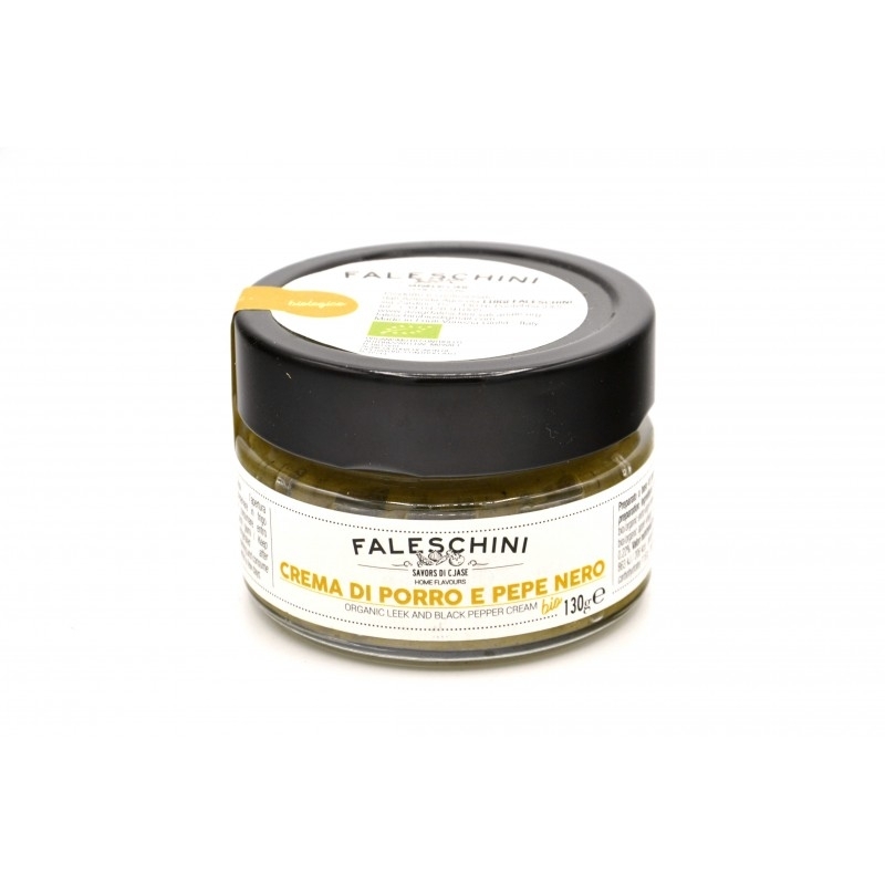 Crema spalmabile di porro e pepe nero dalla consistenza e dal sapore delicato, uno dei prodotti della linea artigianale dell'azienda Faleschini che coniuga insieme il gusto raffinato del porro e quello deciso del pepe nero. Il porro, coltivato nei propri appezzamenti aziendali, viene tritato per essere poi messo in cottura aggiungendo olio di oliva extravergine da spremitura a freddo, sale fino e pepe nero. La crema viene leggermente acidificata con succo di limone e aceto di mela per garantirne una conservazione prolungata. La consistenza è cremosa e il prodotto ha un retrogusto leggermente piccante dovuto alla presenza del pepe nero, che viene aggiunto macinato a pestello.